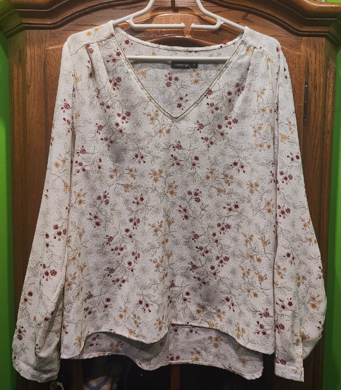 Delikatna i zwiewna bluzeczka. Duża zaleta, że po praniu nie trzeba w ogóle prasować. Dekolt delikatnie zdobiony srebrną nitką. Rękawy zapinane na guzik. Tył jest ciut dłuższy od przodu i zaokrąglony, idealnie pasuje do dżinsowych spodni i spódniczek.