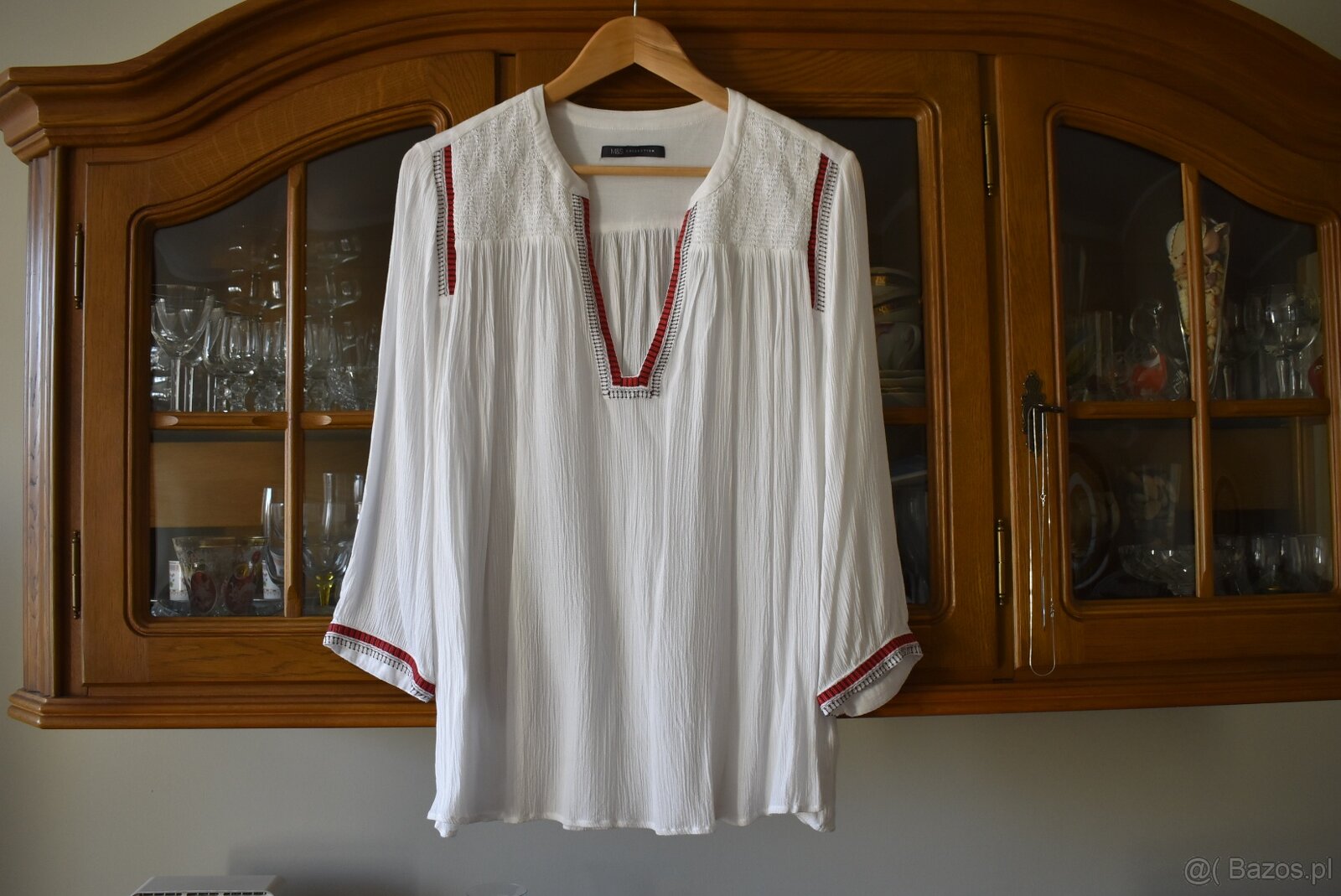 Biała bluzka w stylu boho, 100% wiskoza gnieciona, nie wymaga prasowania.Rozmiar 40-42. Szerokość ramiona 40 cm, szerkość pod pachami 53 cm, długość 67 cm. Używana, stan bardzo dobry.
