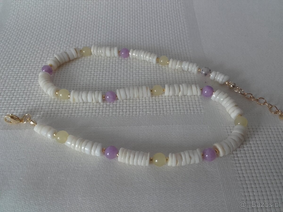 Naszyjnik wykonany z talarków muszli białej i kulek 6 mm kolorowego jadeitu. Długość naszyjnika 40 cm plus 3 cm łańcuszka przedłużającego. Zapięcie i łańcuszek, stal szlachetna pozłacana.
