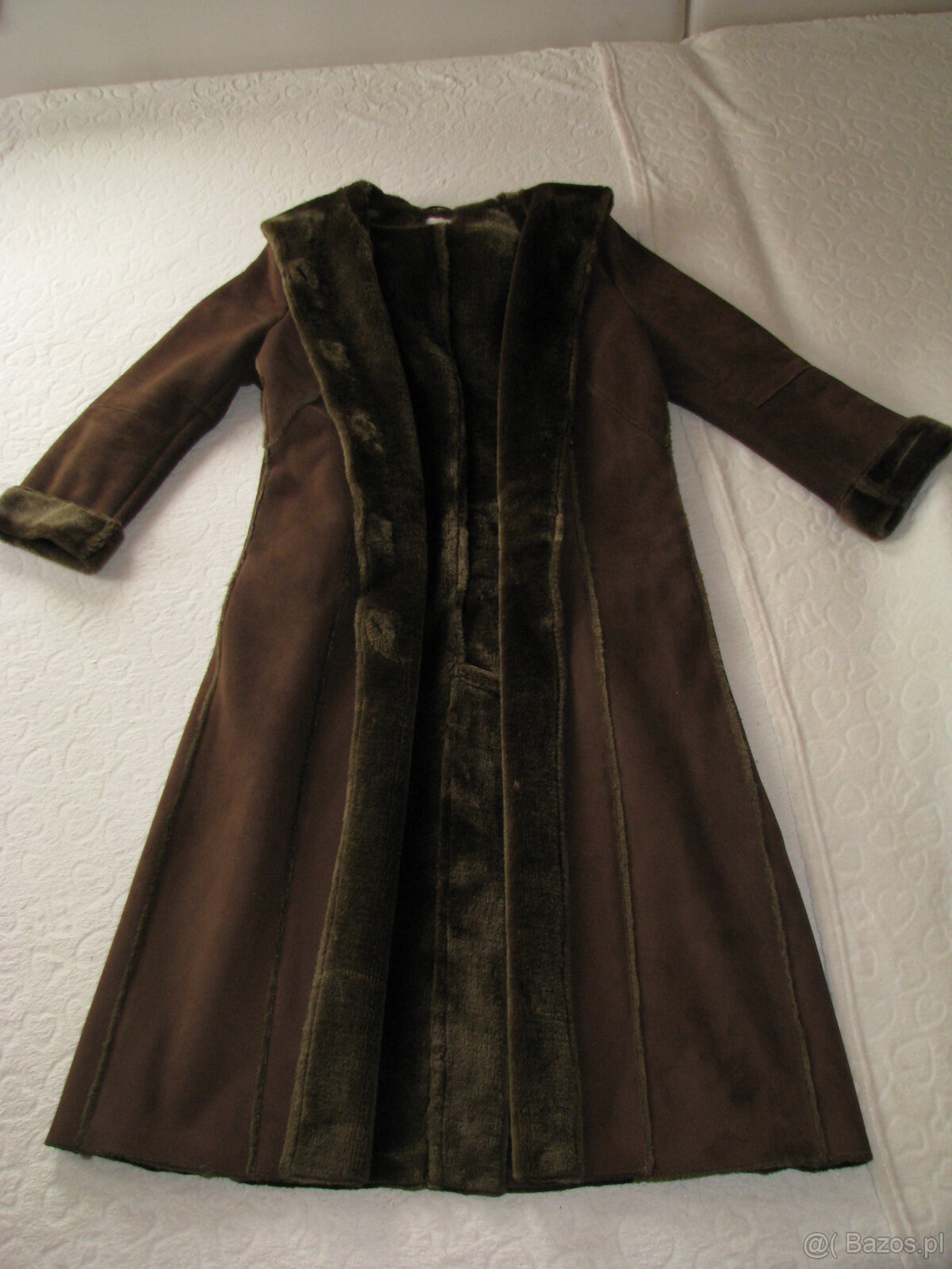 Sprzedam ciepły, dobrej jakości kożuszek damski z kapturem w rozmiarze XXL, wykonany z przyjemnej, miłej w dotyku skóry ekologicznej, w kolorze ciepłego, czekoladowego brązu.
