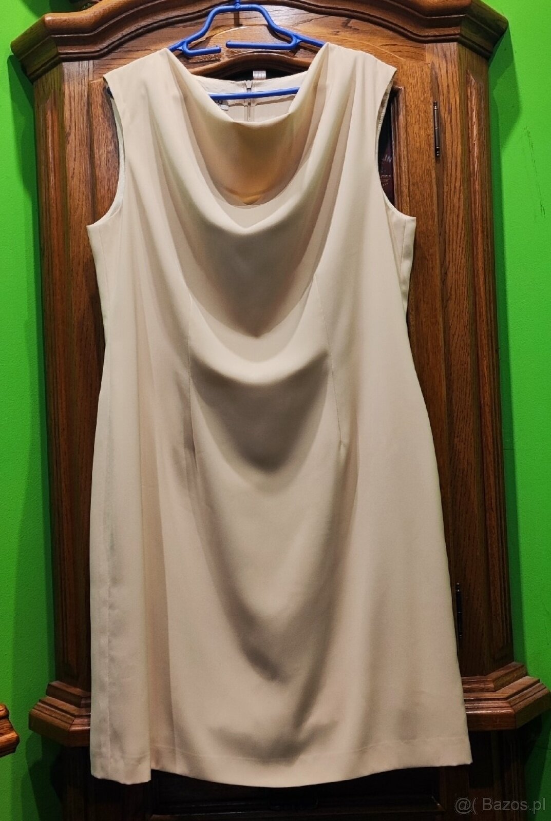 Elegancka sukienka z lejącym dekoltem, w kolorze ecru. Materiał nie rozciąga się. Na ostatnim zdjęciu, miejsce po metce. Wymiary mierzone na płasko: w ramionach 42cm, biust 54cm, talia 49cm, biodra 57cm, dół 59cm, długość 99cm