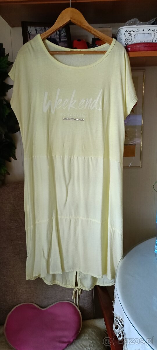 Sprzedam włoską nową sukienkę damską w kolorze jasno żółtym z delikatną z przodu aplikacją Rozmiar 44