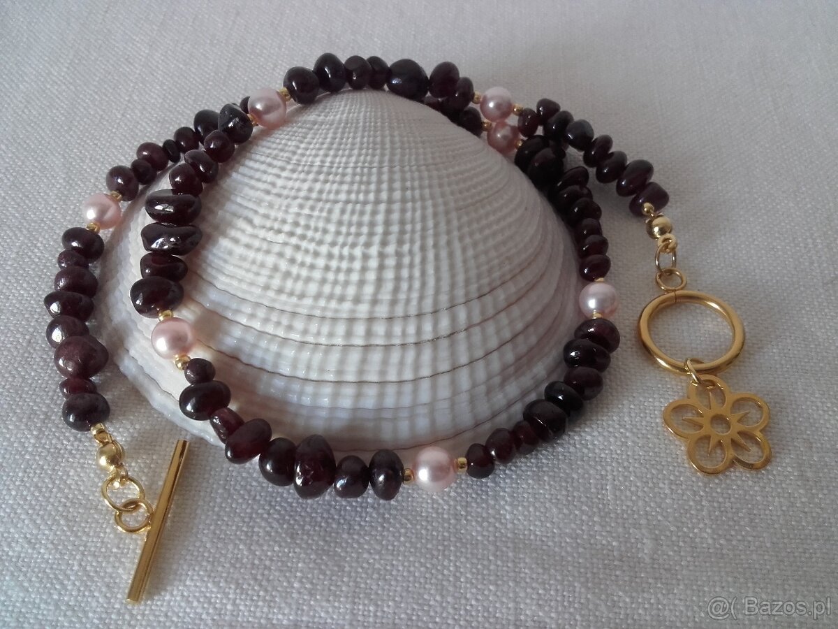 Naszyjnik wykonany z granatu i pereł swarovskiego. Zapięcie stal szlachetna pozłacana. Długość naszyjnika, razem z zapięciem 42,5 cm. Odbiór osobisty w Warszawie lub wysyłka na koszt kupującego.