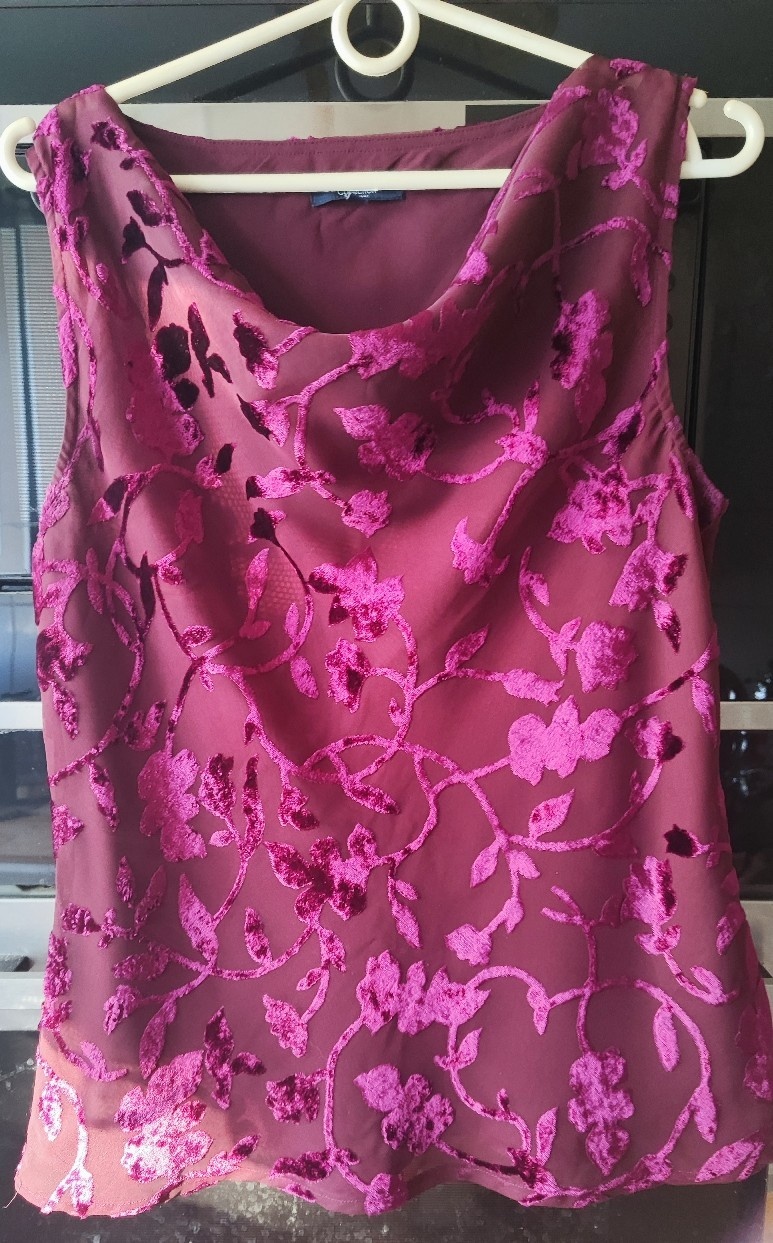 Bordowa bluzeczka na ramiączkach, wizytowa. Motyw- aksamitne liście, z podszewką. Podkreślająca talię. Dekolt lejący, w motywie "wody"