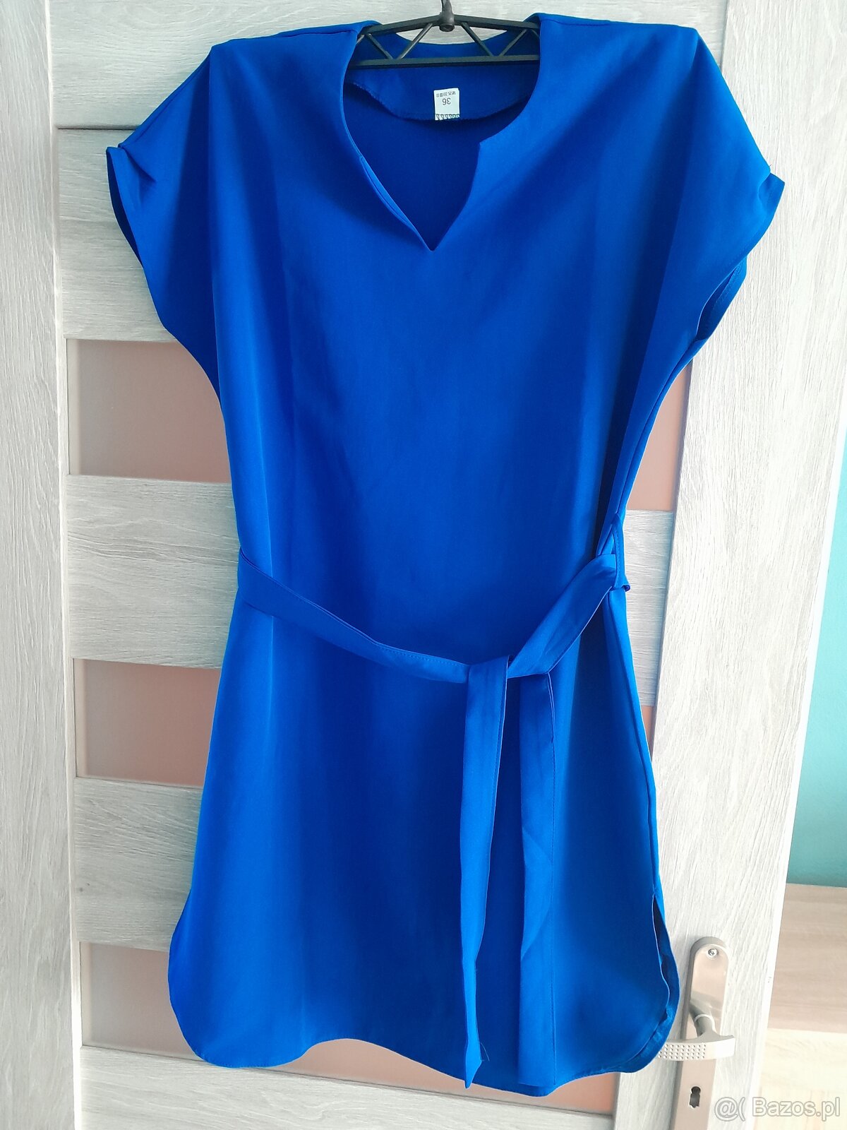 Sprzedam Nową modną damską niebieską sukienkę z paskiem widoczna na zdjęciu.Posiada ona dwa wycięcia na nogę.Załozona tylko raz.