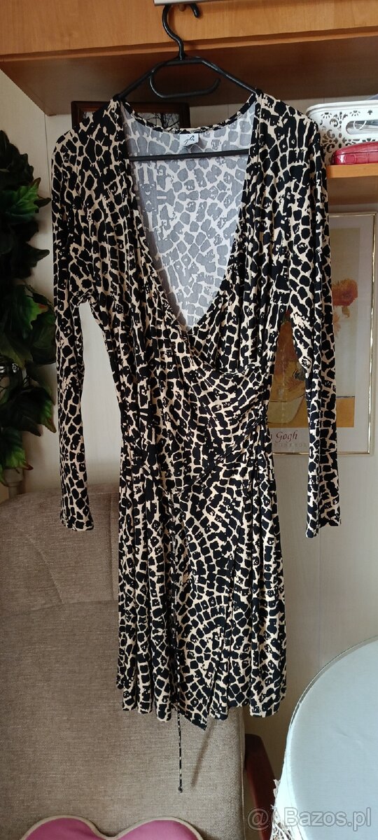 Sprzedam damską sukienkę fason kopertowy w kolorze czarno beżową panterkę. Rozmiar 44 rękaw długi.W biodrach lekko rozkloszowana. Sukienka ma pasek do przewiązania w pasie. Dekolt w literę V.