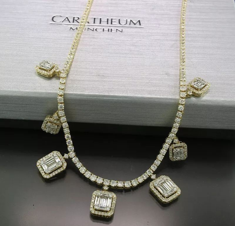 Zapierający dech w piersiach naszyjnik, w całości wysadzany 354 lśniącymi, gwarantowanymi diamentami o szlifie brylantowym i bagietkowym, o łącznej masie około 7,25 karatów. Barwa: G-H / Czystość: VS-Si. Wszystkie diamenty są naturalne i niepoddane obróbce. Zapięcie typu „pudełko” z zabezpieczeniem. Wysokiej jakości złotnicze wykonanie z litego żółtego złota próby 18 kt/750, z cechami próby i masy diamentów.