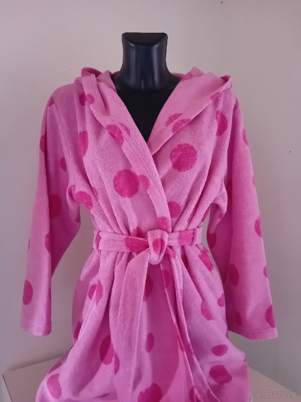 Ciepły, miękki szlafrok z kapturem w kolorze różowym w duże grochy. Szlafrok wykonany z przyjemnego w dotyku materiału, idealny na chłodne wieczory. Wiazany w pasie. Doskonały na co dzień.