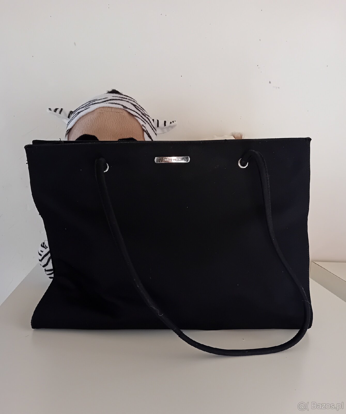 Czarna torebka na ramię. W środku torebki Znajdują sie trzy przegrody oraz kieszonka zasuwana na suwak. Jest dość pakowna, sporo pomieści.
