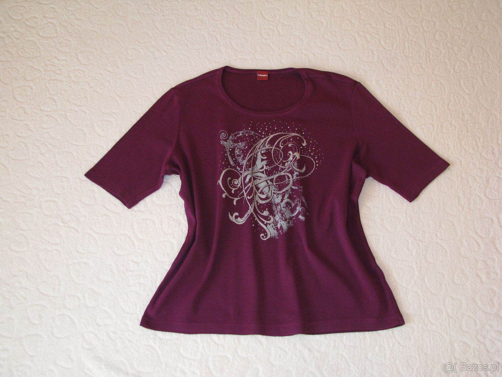 Koszulka lekko taliowana, wykonana z wysokiej jakości, miękkiej bawełny w kolorze bordowego fioletu, z przodu posiada popielato-srebrną aplikację ozdobioną dodatkowo srebrnymi, metalowymi cekinkami, okrągły dekolt wykończony błyszczącymi nićmi w kolorze koszulki, tył gładki.