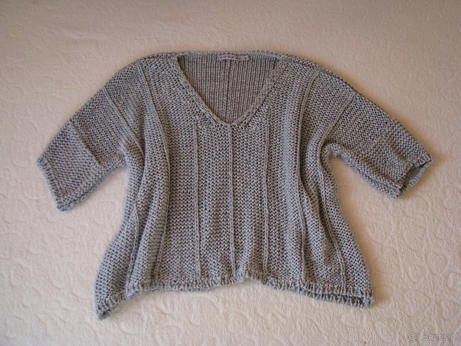 Sweterek koloru siwego z dużymi oczkami, wykonany z włóczki (mieszanka wiskozy 82% i poliestru 18%), przyjemnej w dotyku, z lekkim, metalicznym połyskiem (półmat).