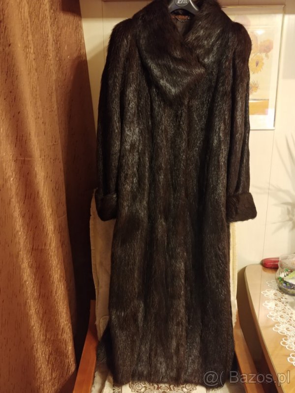 Sprzedam futro z nutrii w kolorze ciemny brąz z pięknym lśniącym połyskiem kołnierz szalowy zapinany na dwa metalowe haczyki.Rękawy mają mankiety którymi można regulować długość rękawa.Rozmiar 42-44.Brak oznak noszenia. Długość od ramienia 127cm obwód klatki 112-114cm futro zapinane na metalowe haczyki.